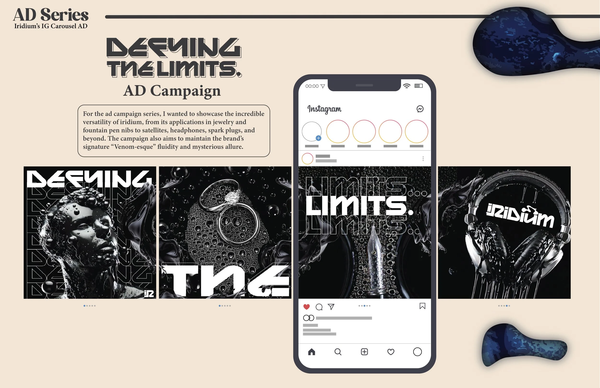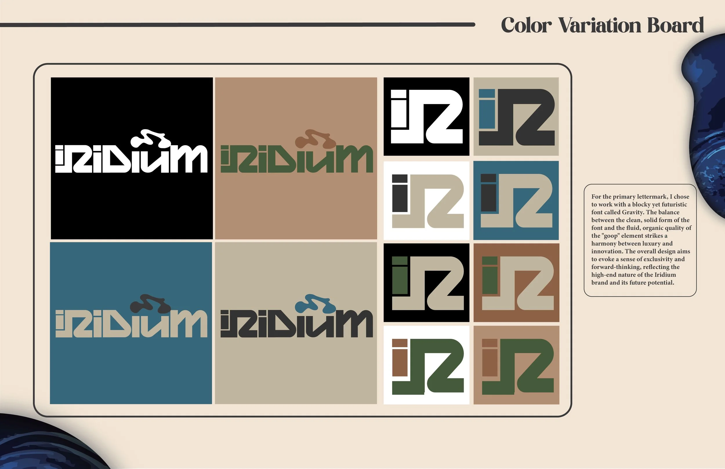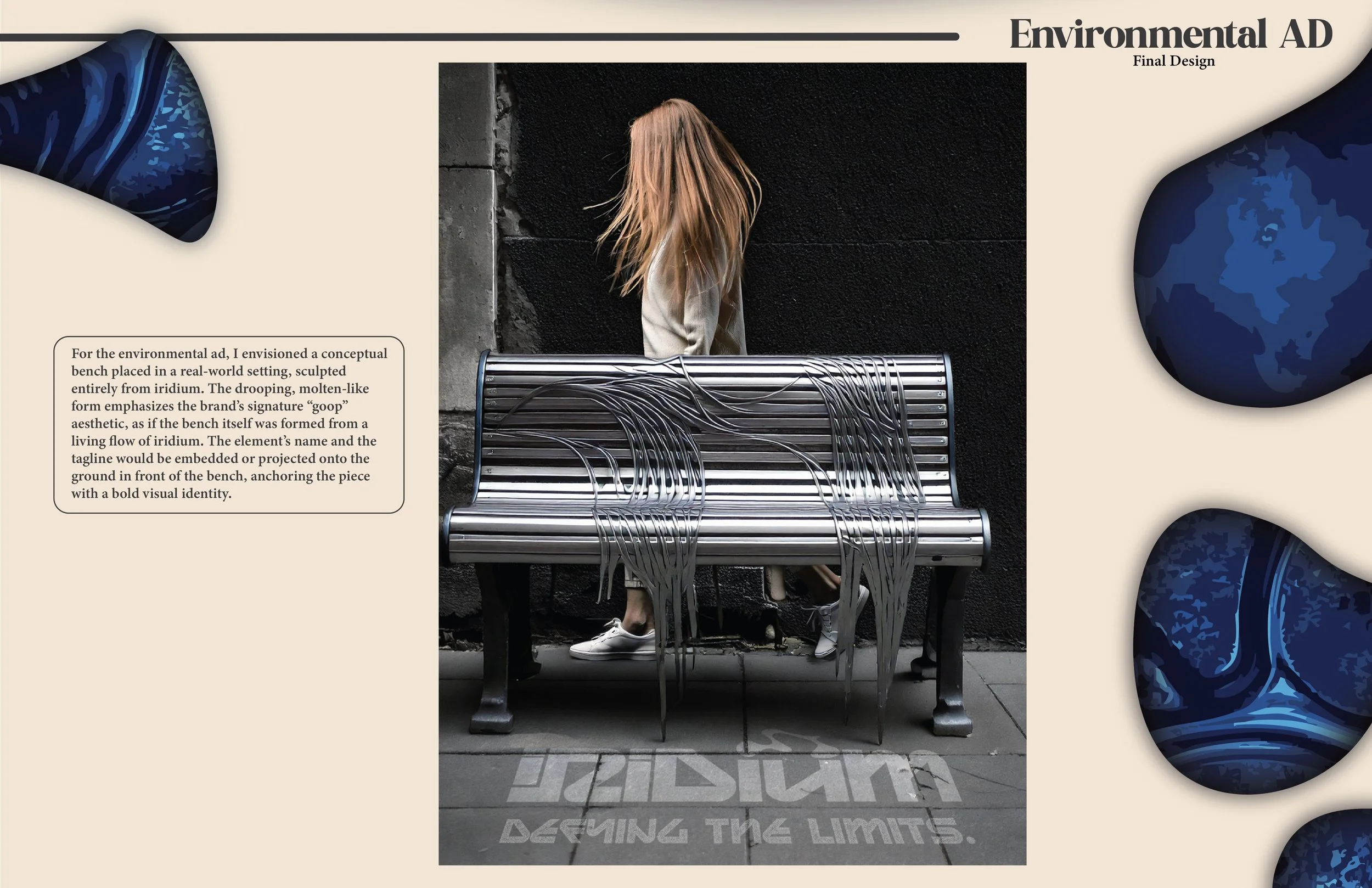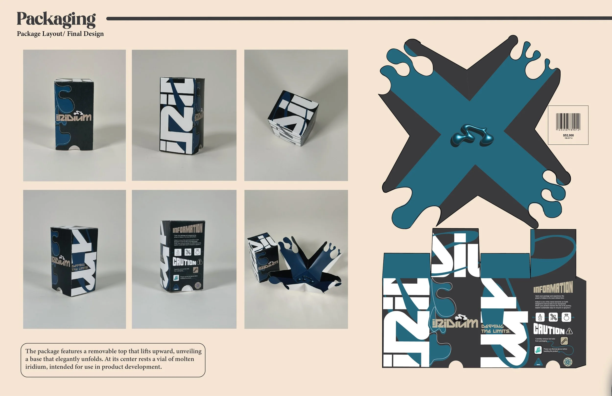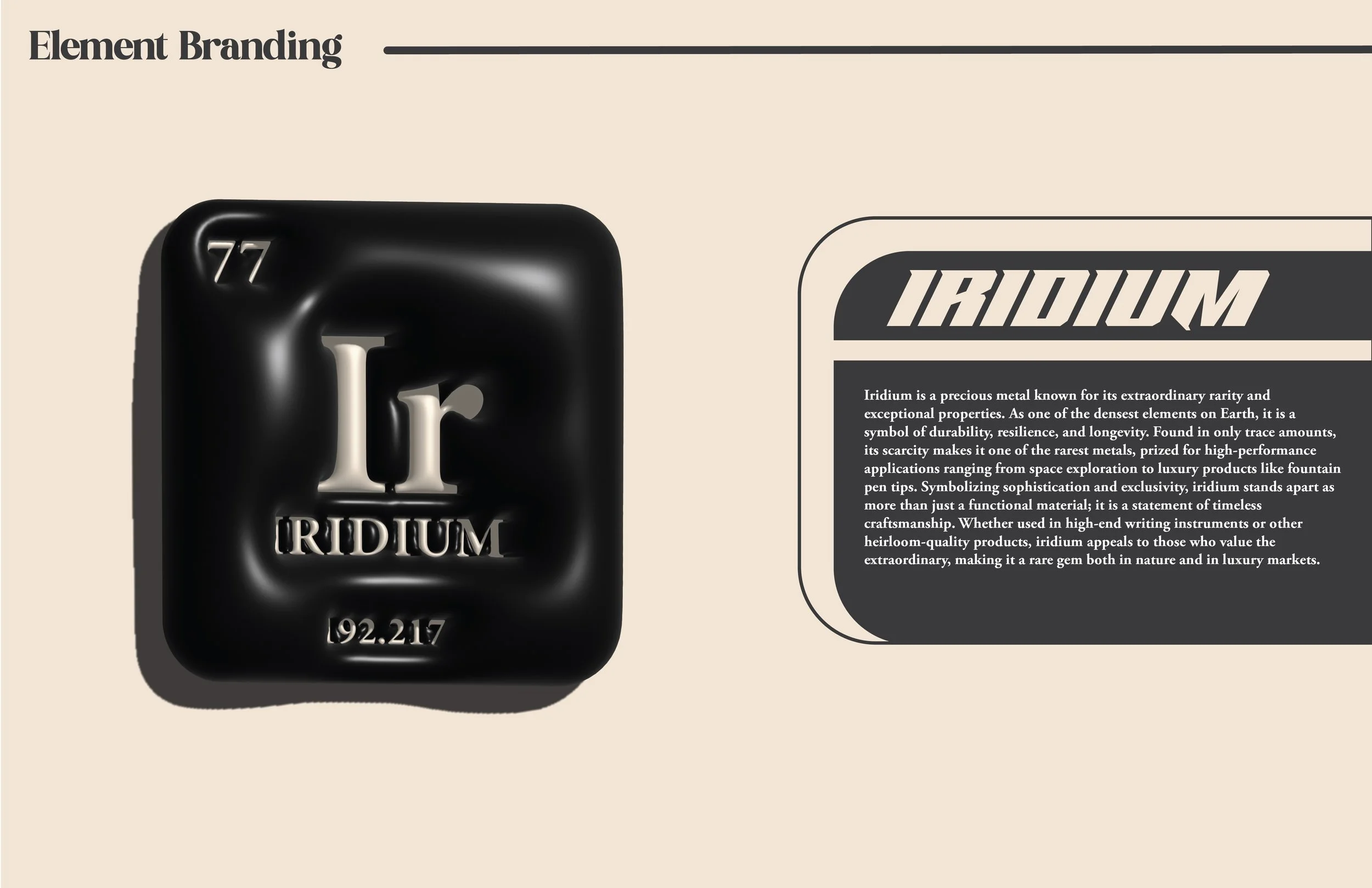 This project began with the challenge of developing a fully realized company inspired by a randomly assigned element from the periodic table. I was assigned iridium and began by researching its unique properties, strength, rarity, and resistance to extreme conditions, which became the conceptual foundation for the brand.