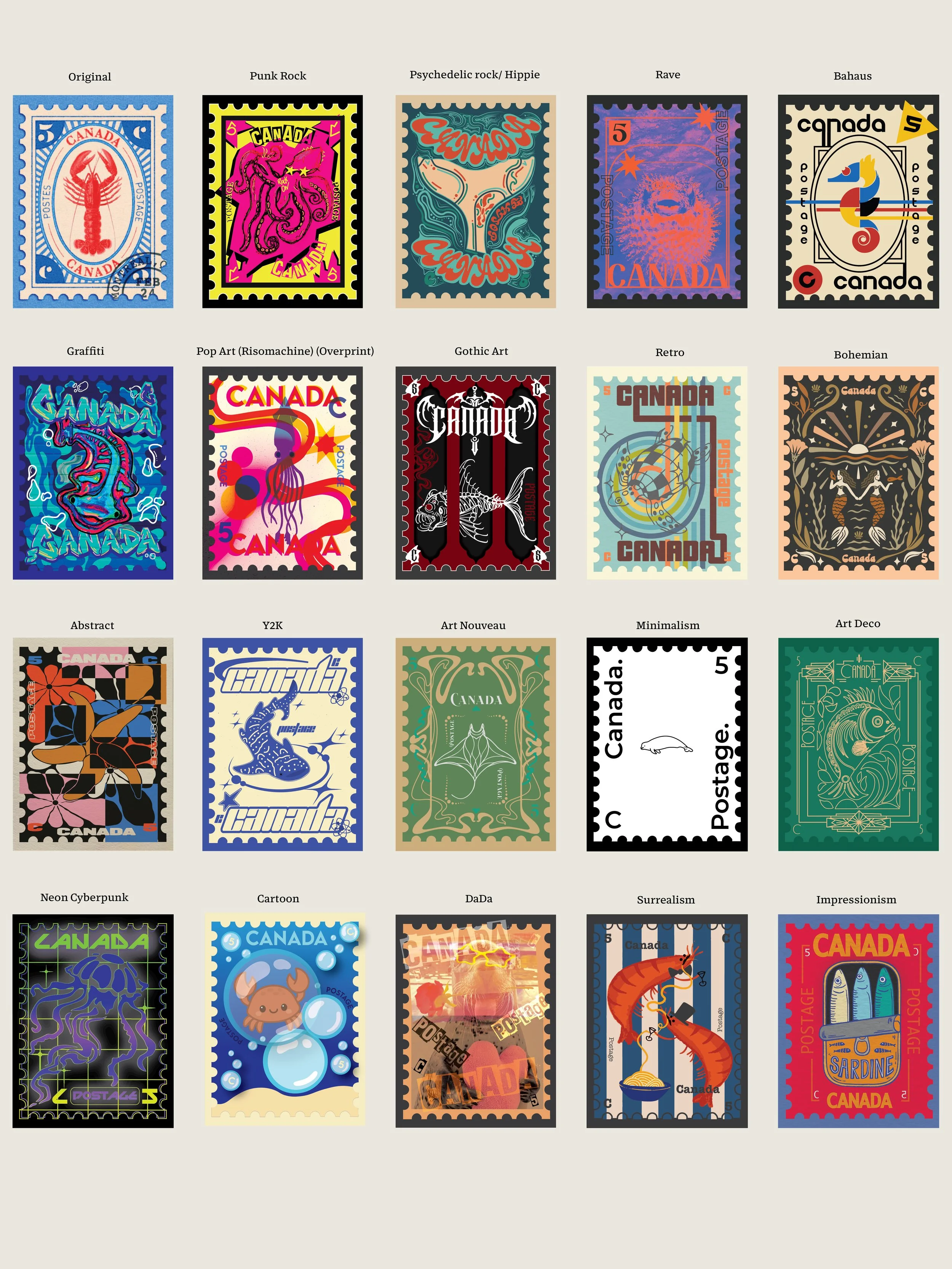 This project explores how one familiar object can change across different visual styles while keeping the same basic structure. Using the postage stamp as a fixed format, I redesigned it 20 times based on various art movements and pop culture influences. Each version required adjusting typography, color, layout, and illustration style while still keeping the key elements of a working stamp. The series highlights adaptability, attention to detail, and the ability to design within clear constraints.